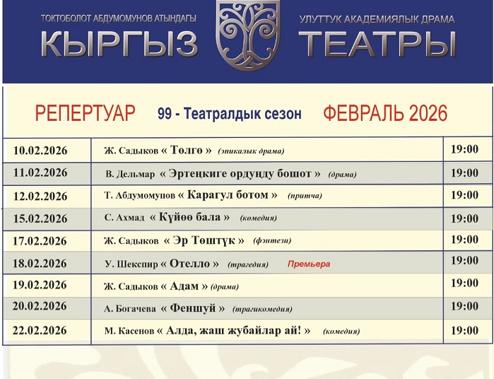 Кыргыз улуттук драма театрынын февраль айына карата репертуарын жарыялады.