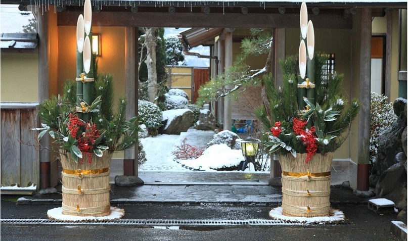 У входа в дом японцы устанавливают новогоднее украшение кадомацу, которое символически охраняет дом от злых сил. Их изготавливают из сосны и бамбука, перевязанных соломенной веревкой. Еще одно украшение — шимеказари — обычно размещается над крыльцом у входной двери домов и в храмах, как пожелание счастья, удачи и всяческих благ.