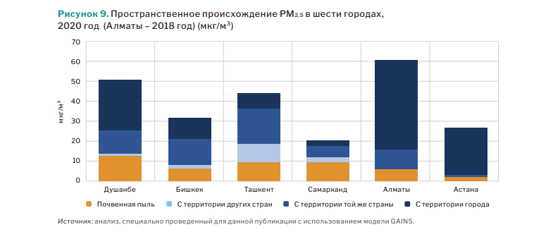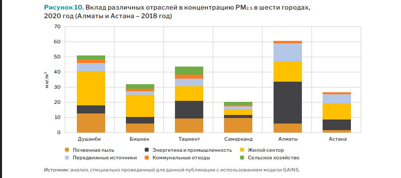 К примеру, во многих городах ЦА вклад почвенной и пустынной пыли в концентрацию PM2,5 гораздо выше, чем в большинстве других регионов мира.