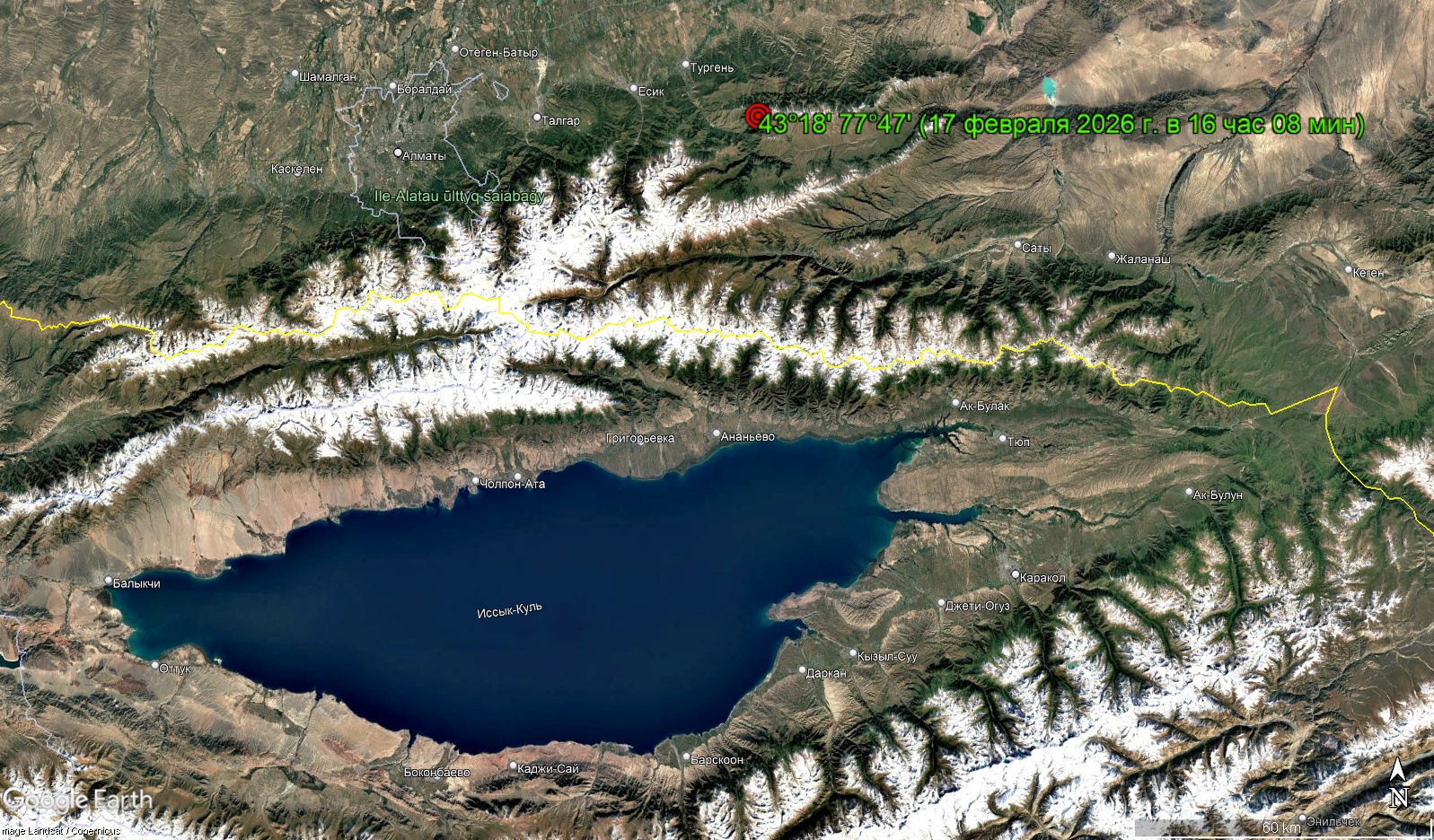 По предварительным данным, очаг землетрясения располагается на территории Казахстана, в 65 километрах к северо-востоку от села Ананьево, в 70 километрах к северо-востоку от Алматы.