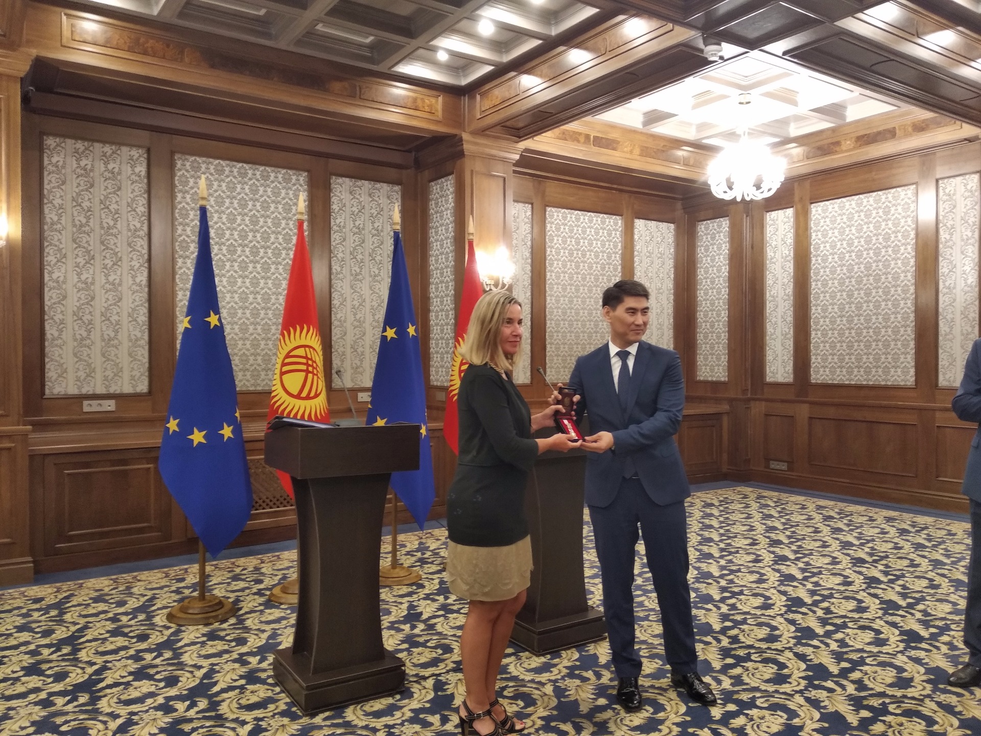 Кроме того, во время двусторонней встречи министр иностранных дел Чингиз Айдарбеков наградил Федерику Могерини орденом «За вклад в развитие взаимоотношений между Кыргызстаном и Европейским союзом».