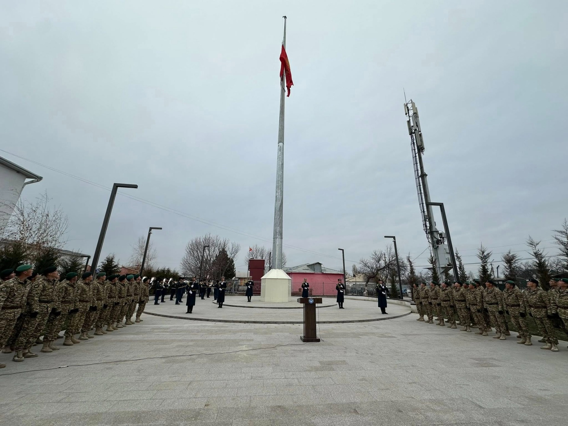 В Баткене состоялась торжественная церемония поднятия государственного флага Кыргызской Республики. Стяг поднят на флагштоке высотой 35 метров под сопровождением военного оркестра, сообщила мэрия города.